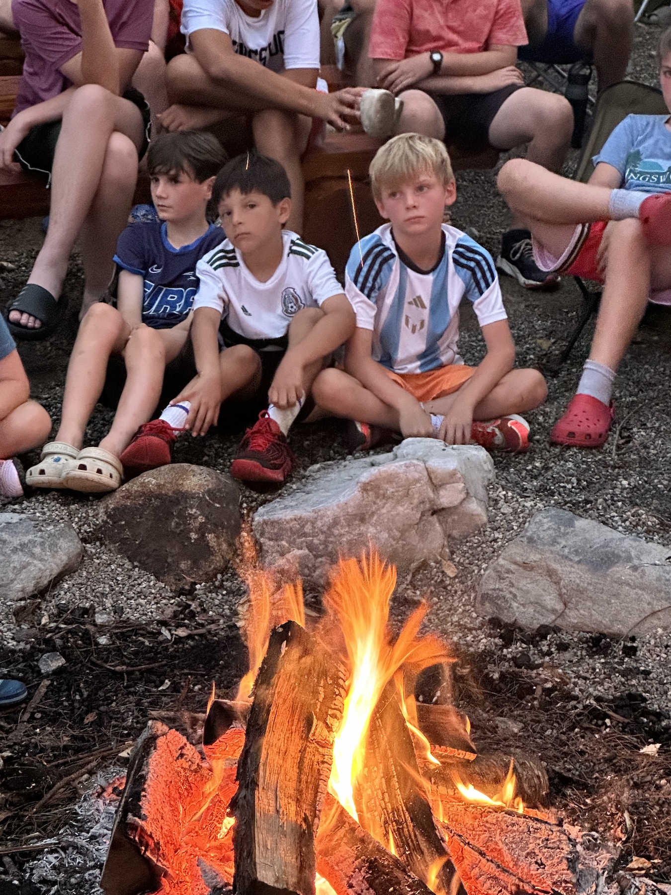 I labeled the blaze as a “bonfire” and maybe it was a tad short of that, but the full-flamed product was a nice and welcoming one to the crowd, who found the benches completely dry by our 8PM commencement. Rob, Mike and I took advantage of that sudden afternoon downpour to tell some stories about camp trips that ran into foul weather.