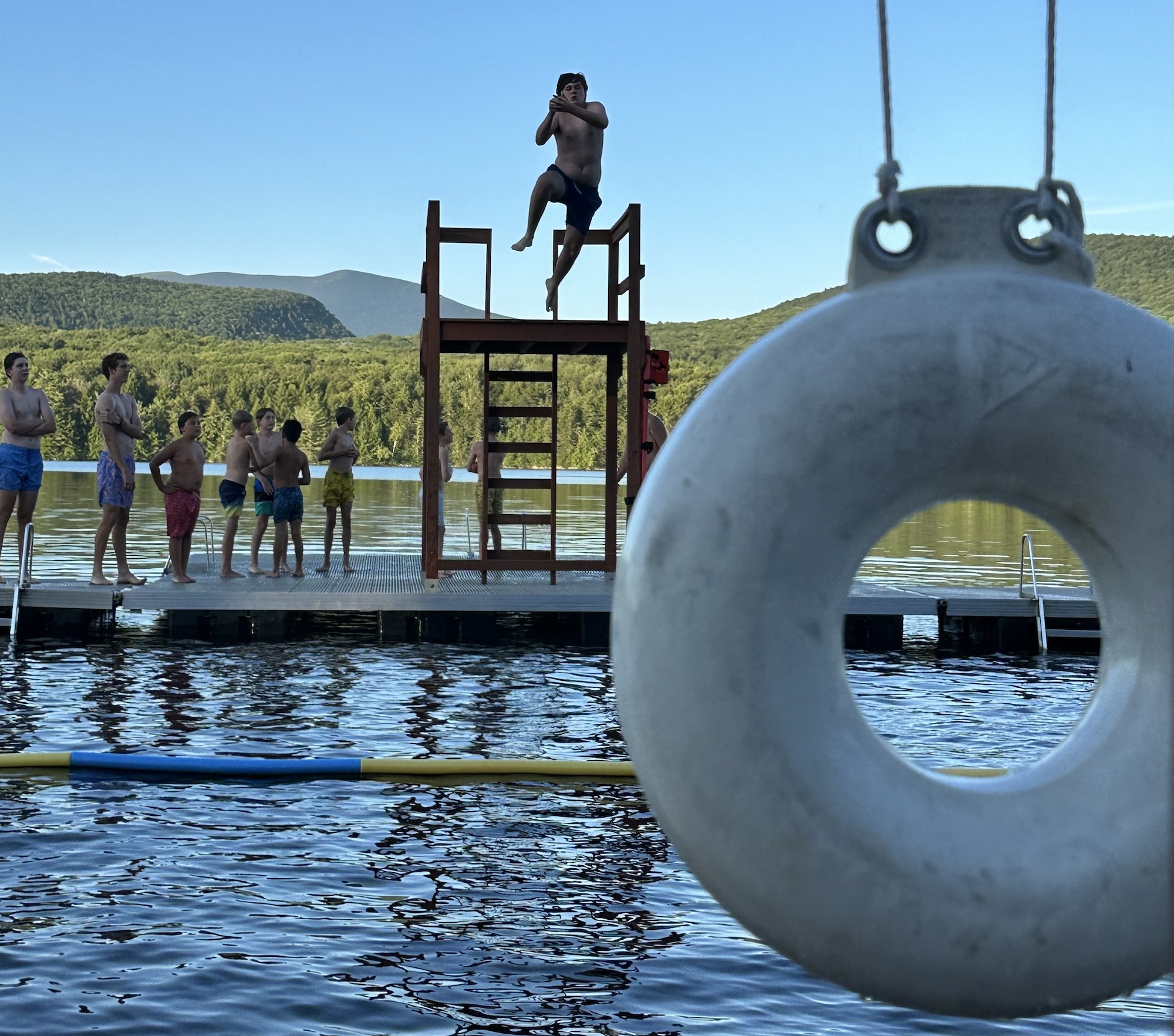 Several photo albums now posted relieve me of some of my OBE angst, and, happily, most do not require an explanation. One exception is the after-dinner gang that assembled at the end of the docks at the tower. One at a time, they timed jumps so to catch a tennis ball tossed by Andy L. in the game that bears his name. The goal: Catch and toss the ball mid-air through the small ring buoy at the other end. The buoy has been “struck” four times in five camp seasons but no one has ever put one through the hole. “That’s why they come,” chuckled Andy.