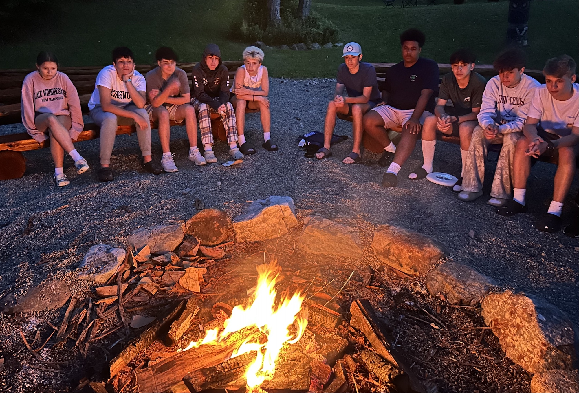 Last evening, we had our first council fire session of the summer. Morgan built a nice fire that was already burning at 8:15 when everyone was summoned down the hill to the brand-new bench assembly down at the water’s edge. Council Fire, while fun, is a solemn camp tradition. I reminded the boys that the early inhabitants of this area used the council (meeting) fire to discuss life and death matters, like finding food and surviving the winter.